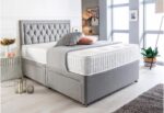 To give your bedroom a touch of elegance and flair, the divan bed base has four exquisitely placed chrome gliders for feet in addition to several chrome accents on the base itself. A luxurious headboard of your choosing is included with the set. It includes a pleated, hand-crafted headboard.