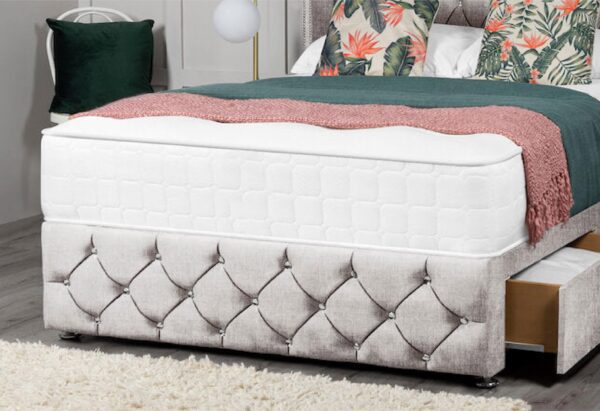 Enjoy a healthier sleeping environment by letting yourself sink into the soft embrace of 8mm hypoallergenic memory foam. The 13.5g open coil spring in this traditional tufted kingsize divan bed mattress offers comfort and support.Â